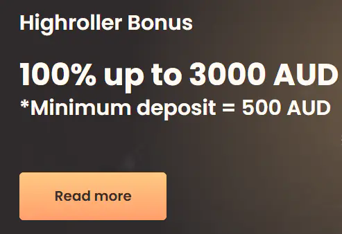 | Highroller Bonus | 100% up to 3,000 AUD | 500 AUD | 40x |