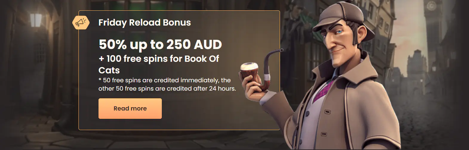 | Friday Reload Bonus | 50% up to 250 AUD | 100 Free Spins for Book of Cats | 20 AUD | 40x |