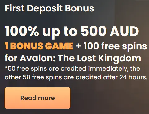 | First Deposit Bonus | 100% up to 500 AUD | 100 Free Spins (50 + 50 after 24 h) | 20 AUD | 40x |